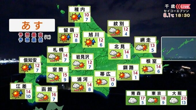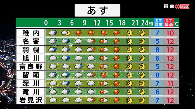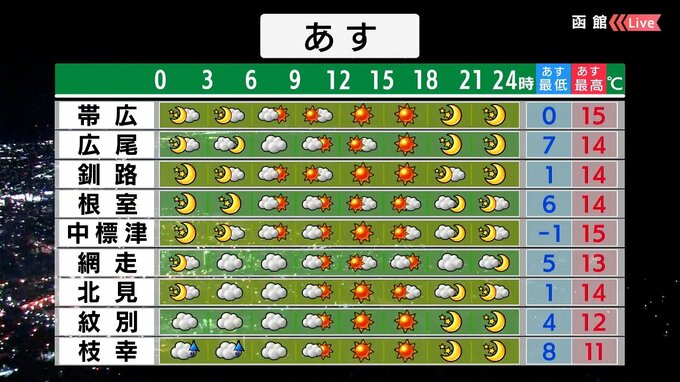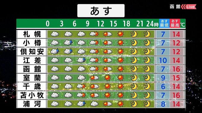 雨は朝までで、日中は各地で晴れるでしょう。最低気温はけさより大幅に高く、札幌は7℃、道南の江差は10℃です。日中は14℃前後まで上がり、10月中旬から下旬並みです。