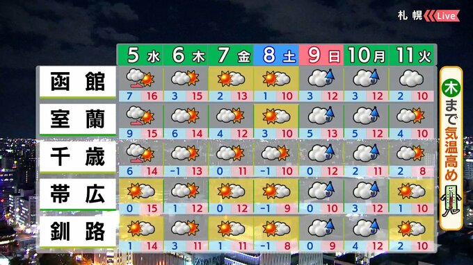 土曜まで広く晴れますが、気温変化は大きくなります。函館は6日も15℃まで上がりますが、7日は10℃くらいで、北風が冷たいでしょう。体調管理に気を付けて下さい。