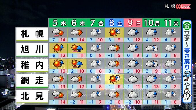 6日も気温は高めですが、夜は道北で雨が降るでしょう。7日は二十四節気の「立冬」で暦の上では冬です。暦通り寒さが戻り、7日から8日にかけては札幌周辺でもうっすら雪の積もるおそれがあります。