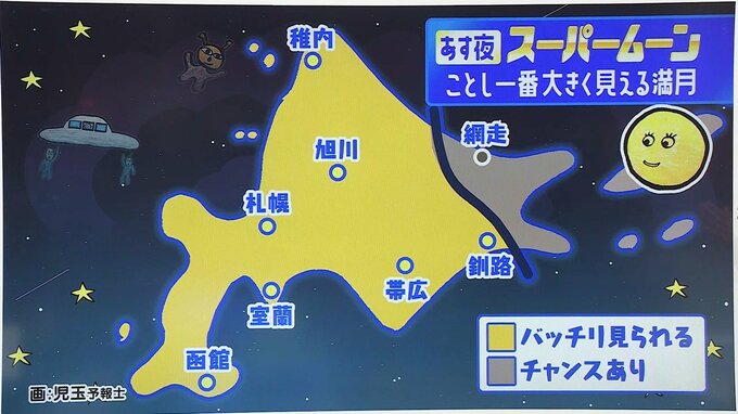 札幌市や旭川市などは広く晴れて、ほとんどの地域で見られそうです。網走市や根室市でも、雲の隙間から見られるチャンスがあります。暖かい服装でスーパームーンを楽しみましょう。