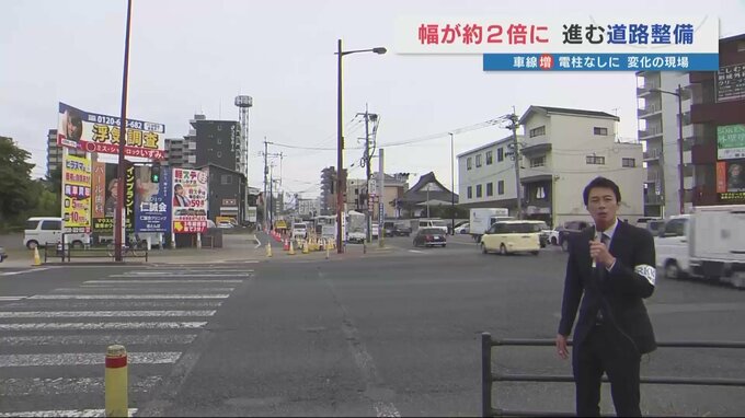 記者「道路の幅を広げる工事にともなって、この区間(浄行寺交差点から子飼のスクランブル交差点までの440m)の電柱がなくなります。そのため電線が地中を通り景観が大きく変わります」