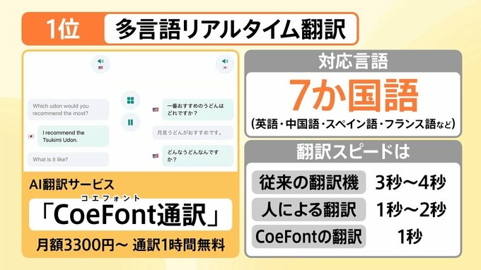 1位の「多言語リアルタイム翻訳」についてみていきます。今までも様々な「翻訳」アプリがありましたが、飛躍的に技術が向上しているということです。