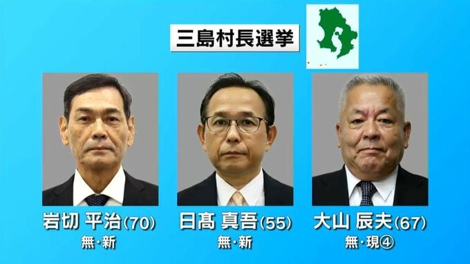 三つどもえの戦いです。任期満了に伴う三島村の村長選挙が4日告示され、現職と新人のあわせて3人が立候補を届け出ました。三島村の村長選挙に立候補したのは、届け出順に新人で元三島村議会議員の岩切平治さん(70…
