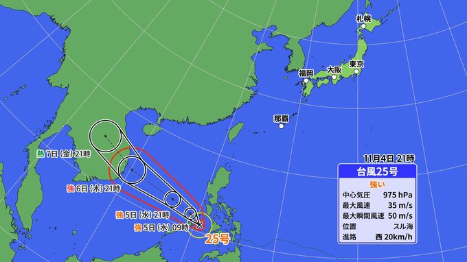 気象庁によりますと、4日午後9時時点で、強い勢力の台風25号はフィリピンの西に位置しています。【雨と風のシミュレーションを画像で掲載しています】。