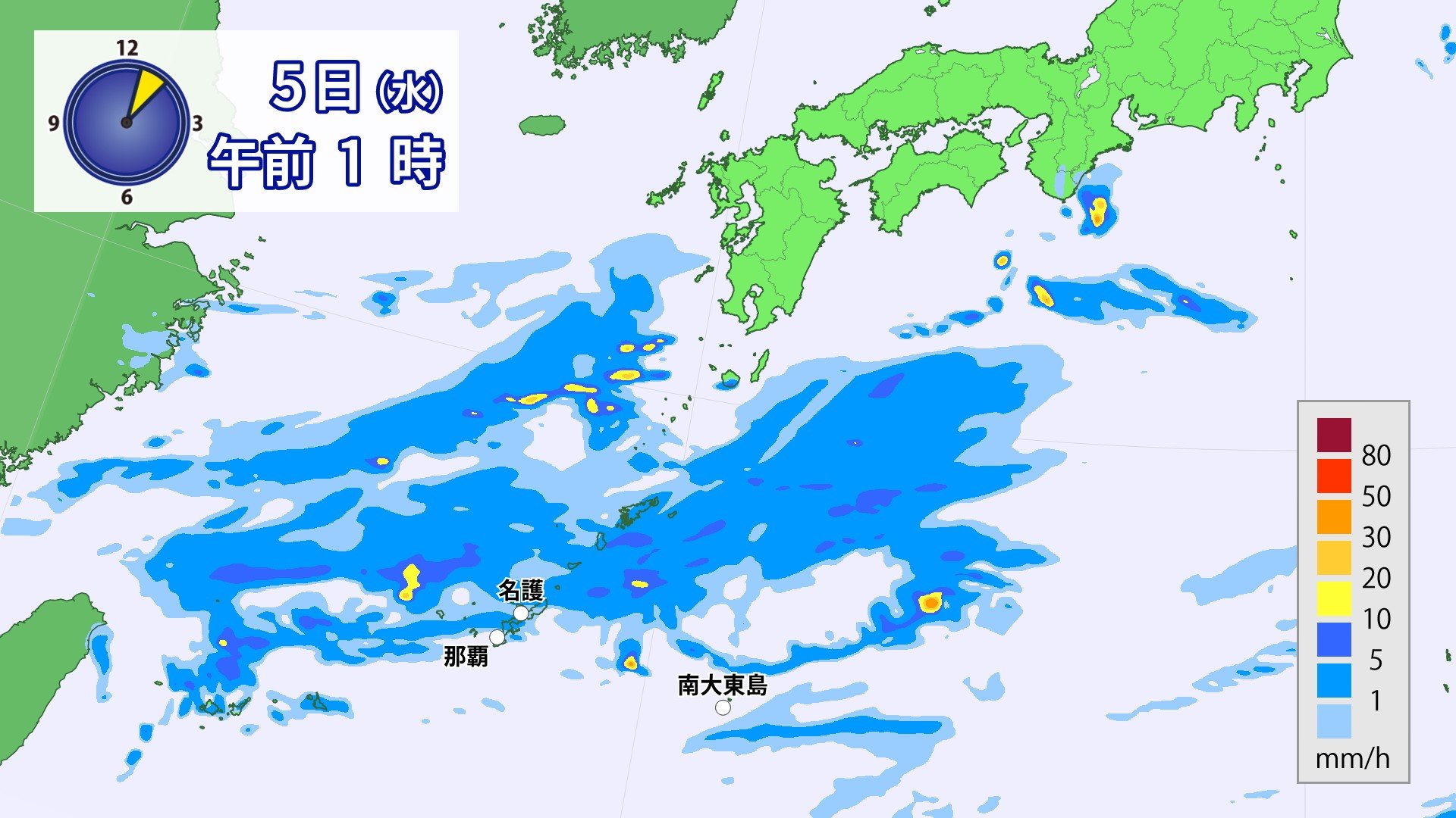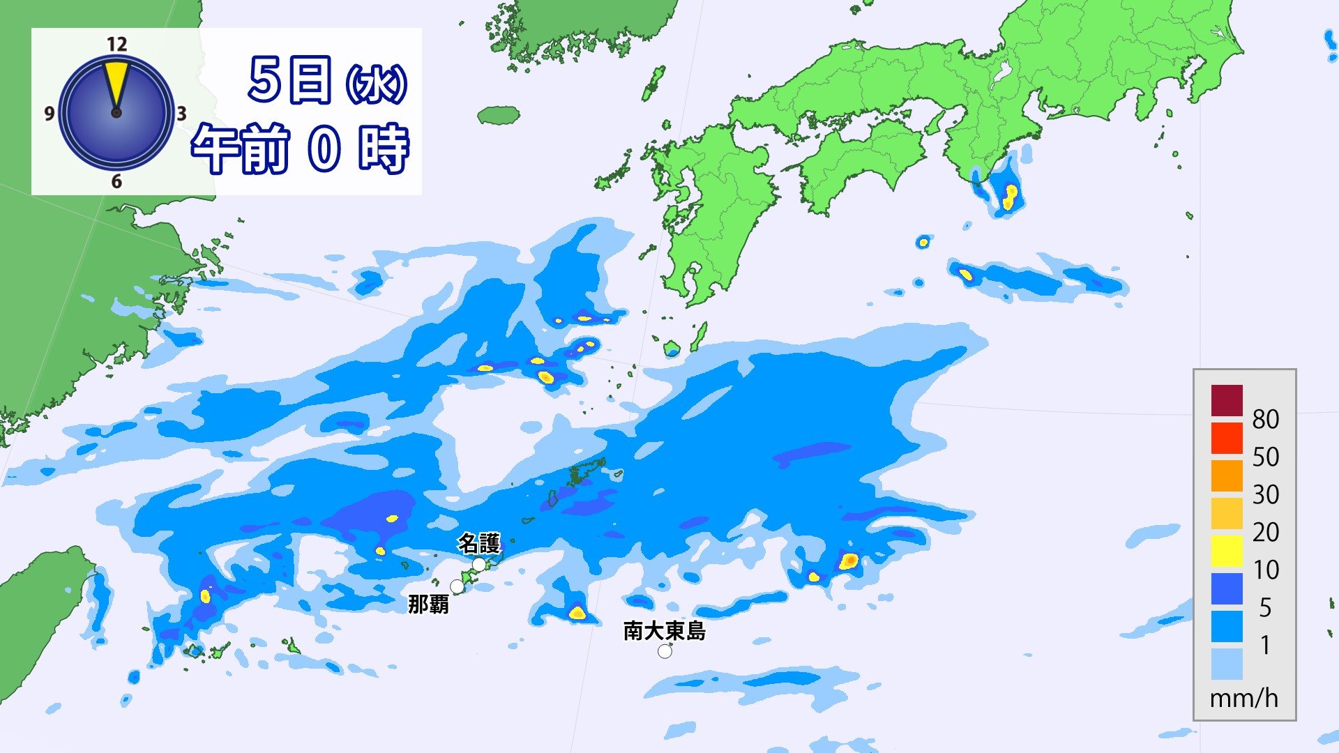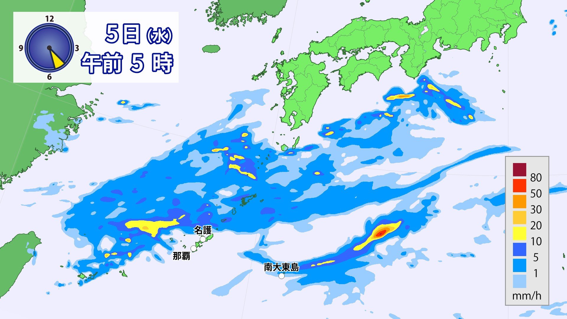 【警報級の大雨予想】5日の沖縄本島地方 激しい雨に雷伴うおそれ 道路冠水、土砂災害、低い土地の浸水、河川の増水に注意 琉球放送 2025年11月4日(火) 21:40 国内 天気 ■4日夜~5日早朝までの雨雲の予想