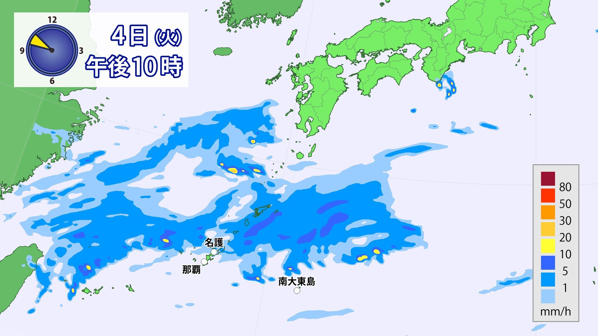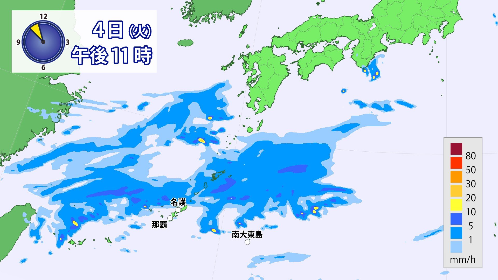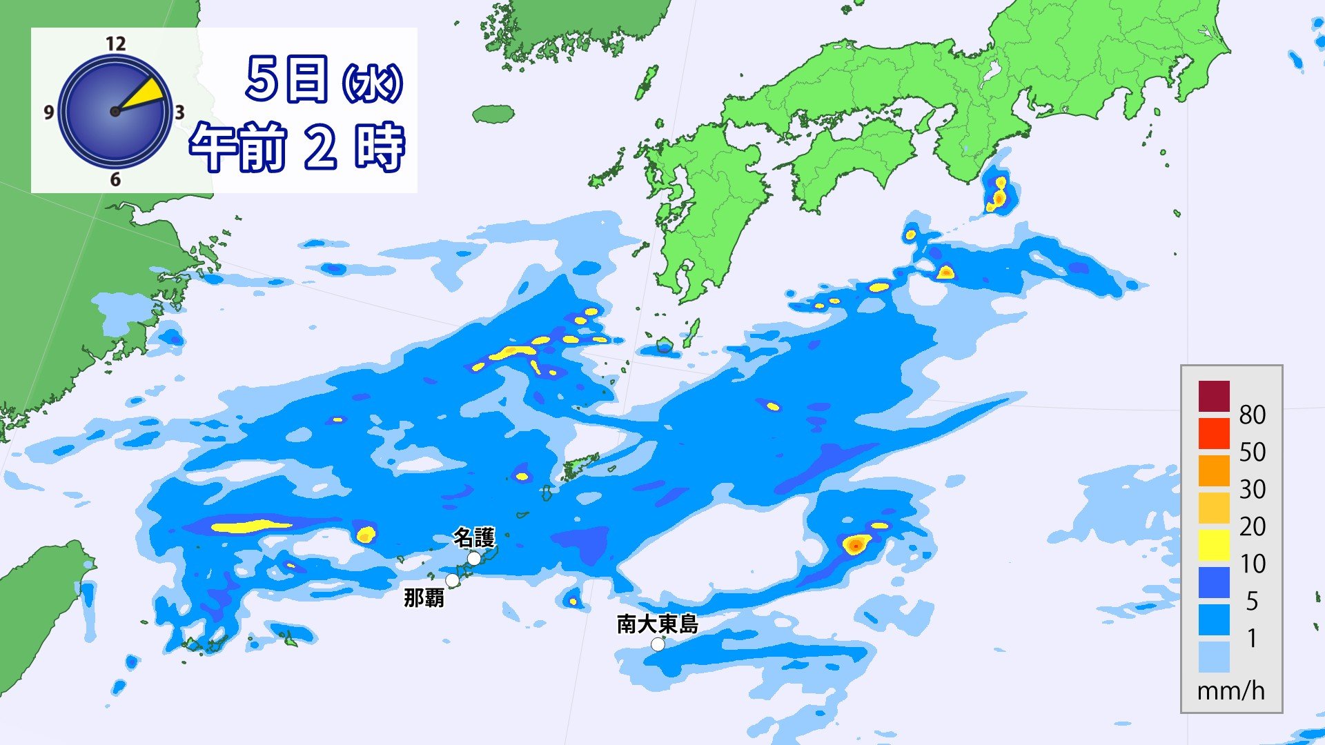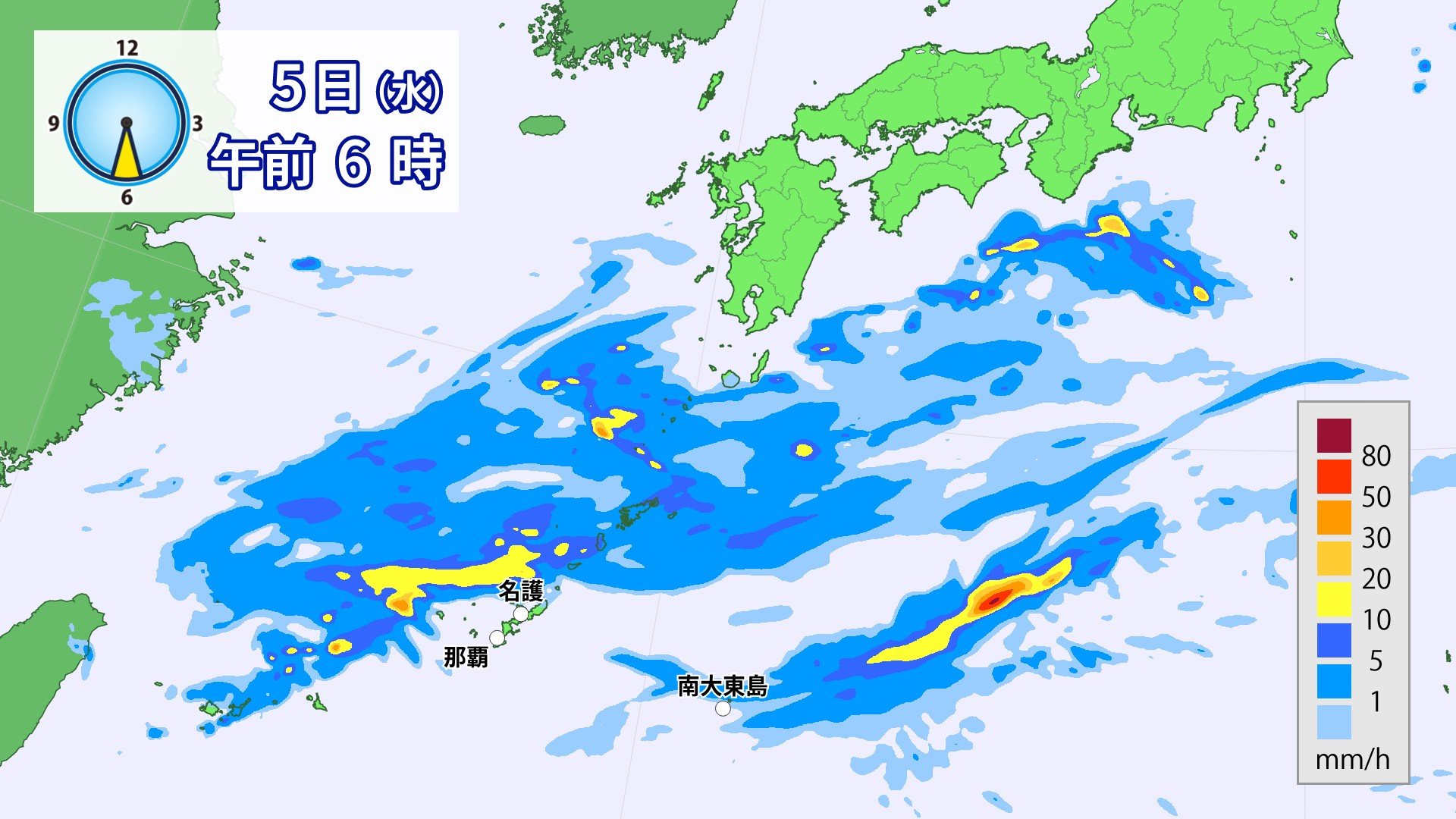 【警報級の大雨予想】5日の沖縄本島地方 激しい雨に雷伴うおそれ 道路冠水、土砂災害、低い土地の浸水、河川の増水に注意 琉球放送 2025年11月4日(火) 21:40 国内 天気 ■4日夜~5日早朝までの雨雲の予想