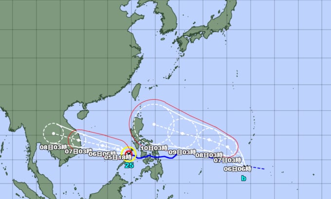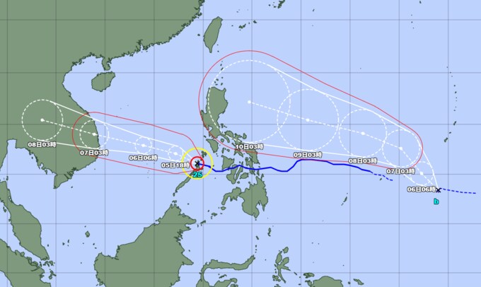 進行方向、速さ 西北西 25 km/h (13 kt)