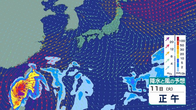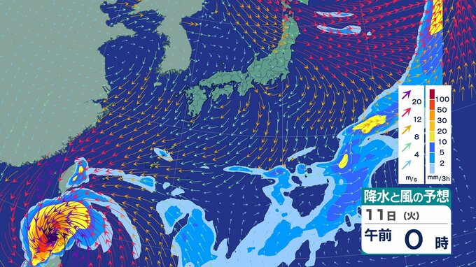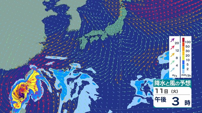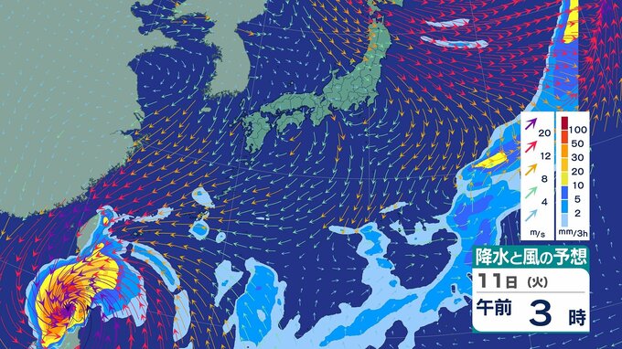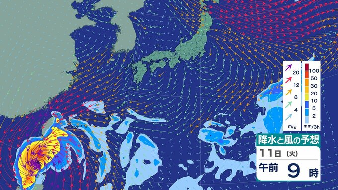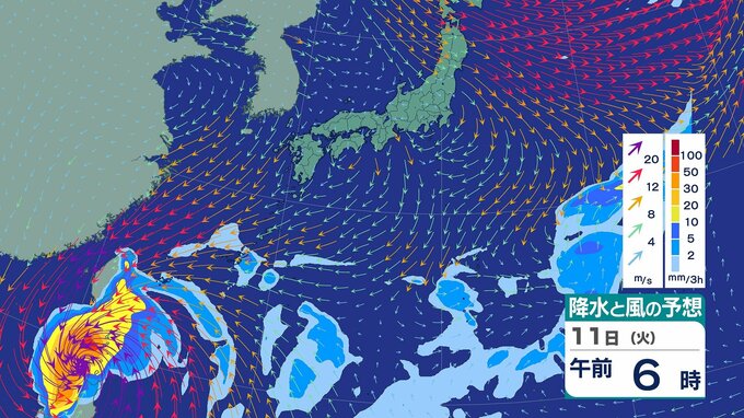 【ダブル台風】26号「フォンウォン」発生 最大瞬間風速25メートル 約20キロの速さで北北西へ[雨と風のシミュレーションを見る](気象庁) テレビ山口 2025年11月6日(木) 09:47 国内 11日(火)の雨と風のシミュレーション
