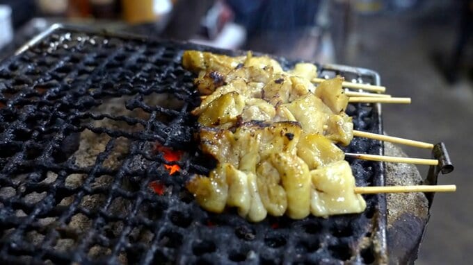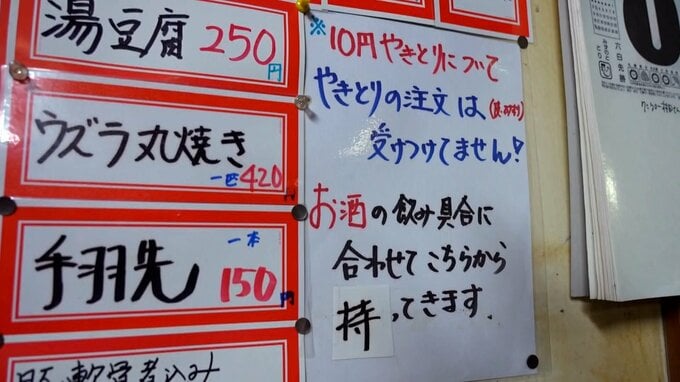 例えば、生ビールを一杯、追加注文すると、店主がお酒の進み具合を確認しながら、10円焼き鳥を1人5本ほど提供してくれます。