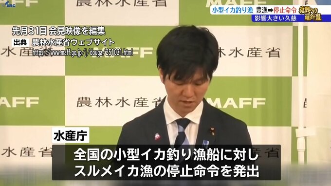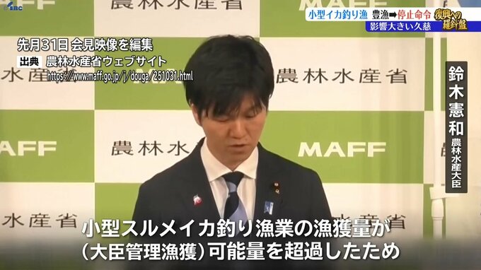 鈴木憲和農林水産大臣は10月31日、水産庁が11月1日から全国の小型イカ釣り船漁業者に対しスルメイカ漁を停止するよう命令したと明らかにしました。