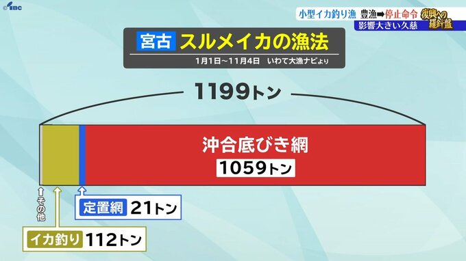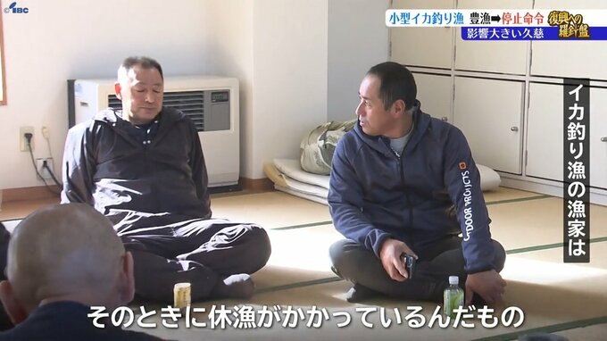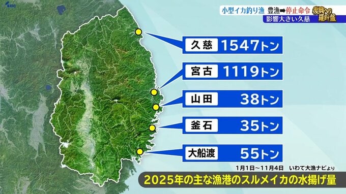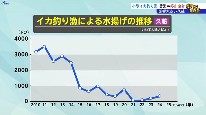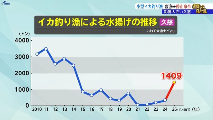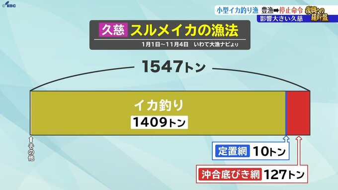 一方、久慈はイカ釣りによる漁獲が水揚げ全体の9割を超える1409トンに上り、今回の停止命令が浜を直撃した形です。
