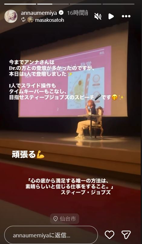 またインスタグラムのストーリーズには、「目指せスティーブジョブズのスピーチです 頑張る」と綴り、スティーブ・ジョブズの「心の底から満足する唯一の方法は、 素晴らしいと信じる仕事をすること。」という言葉を添えました。
