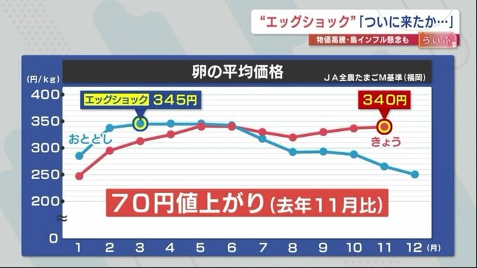 JA全農たまごによりますと、Mサイズ1㎏の月平均価格は340円。1年前と比べて70円も値上がりし、「エッグショック」と呼ばれた2023年の最高値「345円」に迫る勢いです。