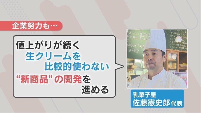 乳菓子屋 佐藤憲史郎代表「厳しいです。価格転嫁ができないのが一番キツいですね。ある程度は値上げしているが原価率でいうともっと上げないと合わないけれど、100円上げたいところを60円とかにしている」