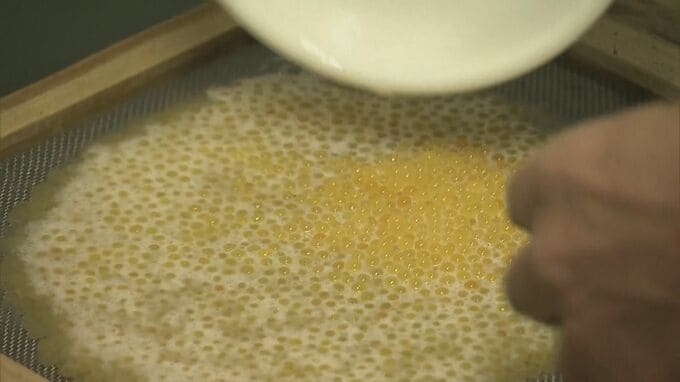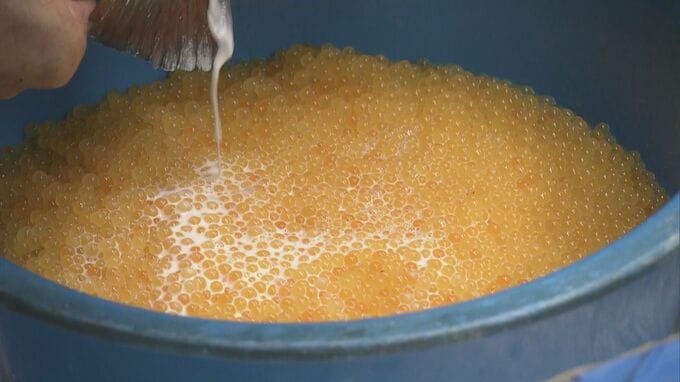 この時期、体長40センチほどに育ったメスから一粒約5ミリの黄金色の卵を採取し、人工授精させていきます。