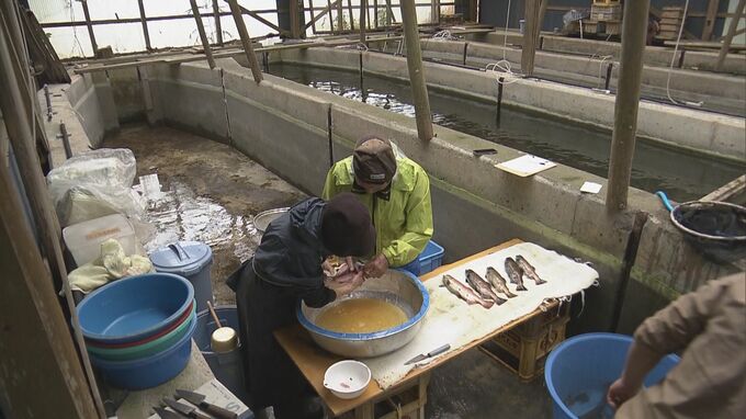 三重県熊野市で養殖アマゴの人工授精が行われています。