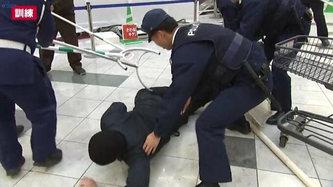「今、刃物を持った犯人役の男を取り押さえようと、さすまたやカートを使って対応しています」
