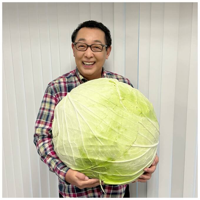 投稿された写真には、さださんが大きな緑色のキャベツを両手で抱え、満面の笑みを浮かべている様子が写っています。重量感のあるキャベツの鮮やかな緑色と葉脈がはっきりと確認でき、そのサイズの大きさに驚かされます。
