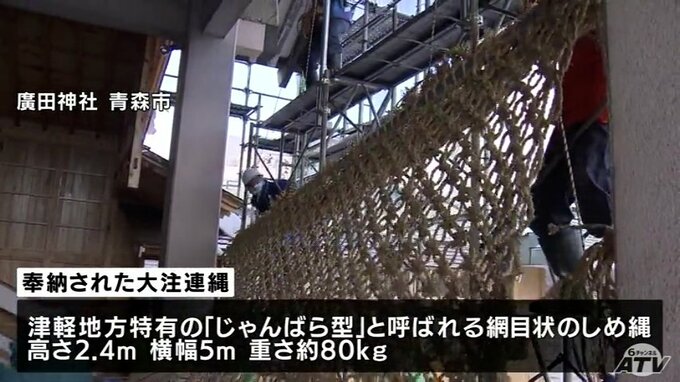 青森県青森市の廣田神社で津軽地方特有の「じゃんばら型」と呼ばれる大注連縄の掛け替えが3年ぶりに行われました。廣田神社に奉納されたのは幅5メートル、高さ2.4メートルの「じゃんばら型」と呼ばれる網目状のし…