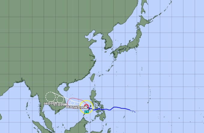 進行方向、速さ 西北西 25 km/h (13 kt)