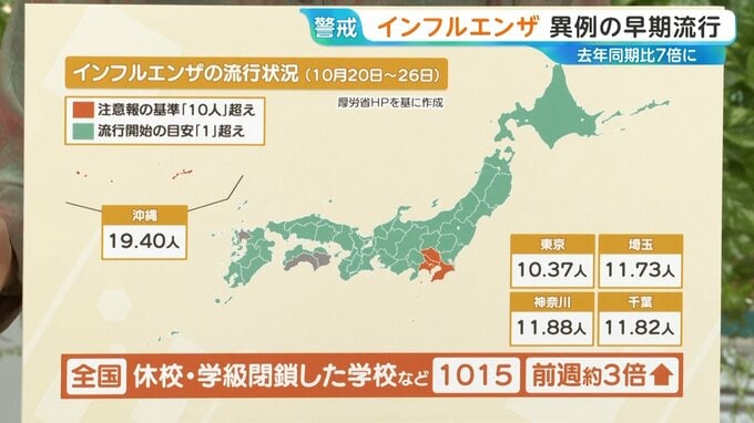 厚労省HPによると、注意報の基準となる「10人」を超えているのは東京・埼玉・千葉・神奈川・沖縄で、全国で1015の学校が休校・学級閉鎖しており、前の週と比べると約3倍に増えています。(10月20日~26日)
