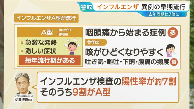 都内のいとう王子神谷内科外科クリニックでは、インフルエンザ検査の陽性率が約7割、そのうち9割がA型ということです。