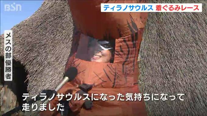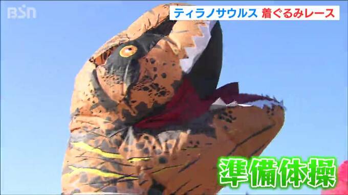 新潟県十日町市で恐竜の着ぐるみを着て走るユニークなレースが行われ、縄文遺跡のPRが行われました。