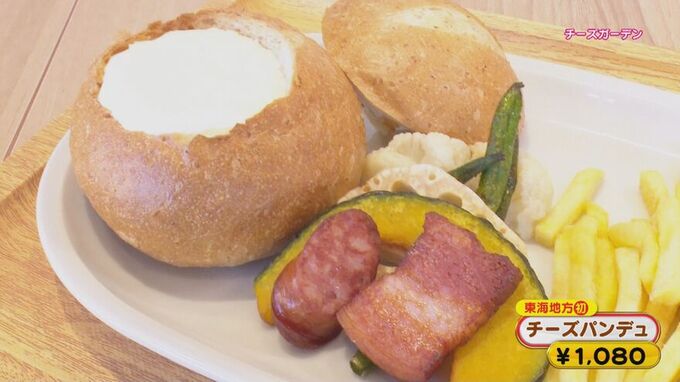 東海地方初のカフェ併設店舗なので、イートインが可能に。イチオシは、野菜をチーズにディップして食べる「チーズパンデュ」(1,080円)。約7種類の揚げ野菜に、オリジナルブレンドのチーズフォンデュをたっぷりつけていただきます。栃木県から仕入れたこだわりのベーコンは、ジューシーで絶品!
