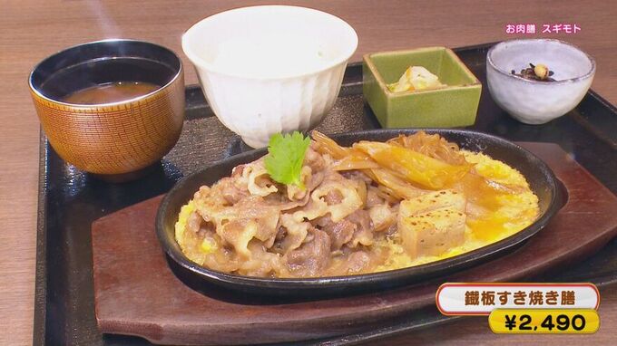 創業125年にして、新たなスタイルのすき焼きが誕生!それが、「鐡板すき焼き膳」(2,490円)。厳選した黒毛和牛に、スギモト秘伝の割り下を使用。1人用の鉄板には溶き卵が注がれており、定食としてすき焼きを手軽に食べられます。