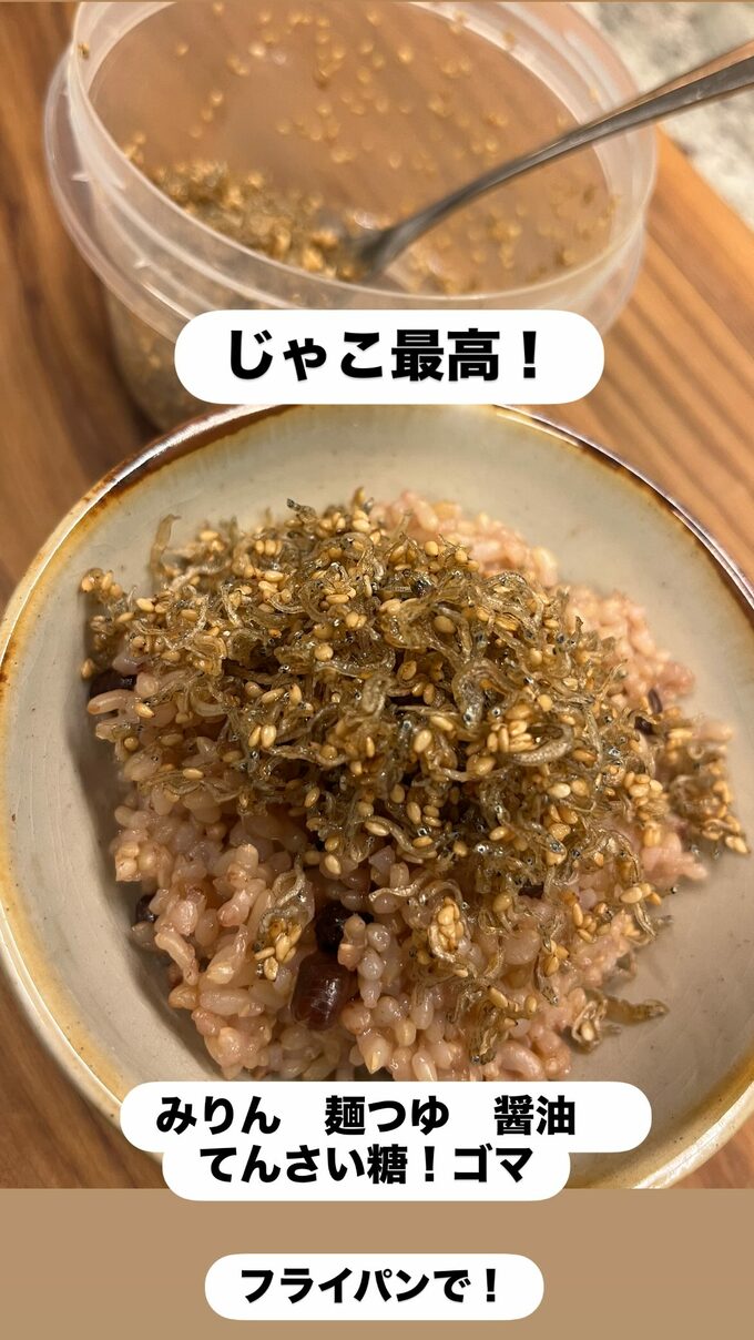 投稿には「じゃこ最高!」というコメントとともに、レシピの材料として「みりん 麺つゆ 醤油 てんさい糖! ゴマ」と記されています。また、調理方法として「フライパンで!」という調理のポイントも添えられていました。