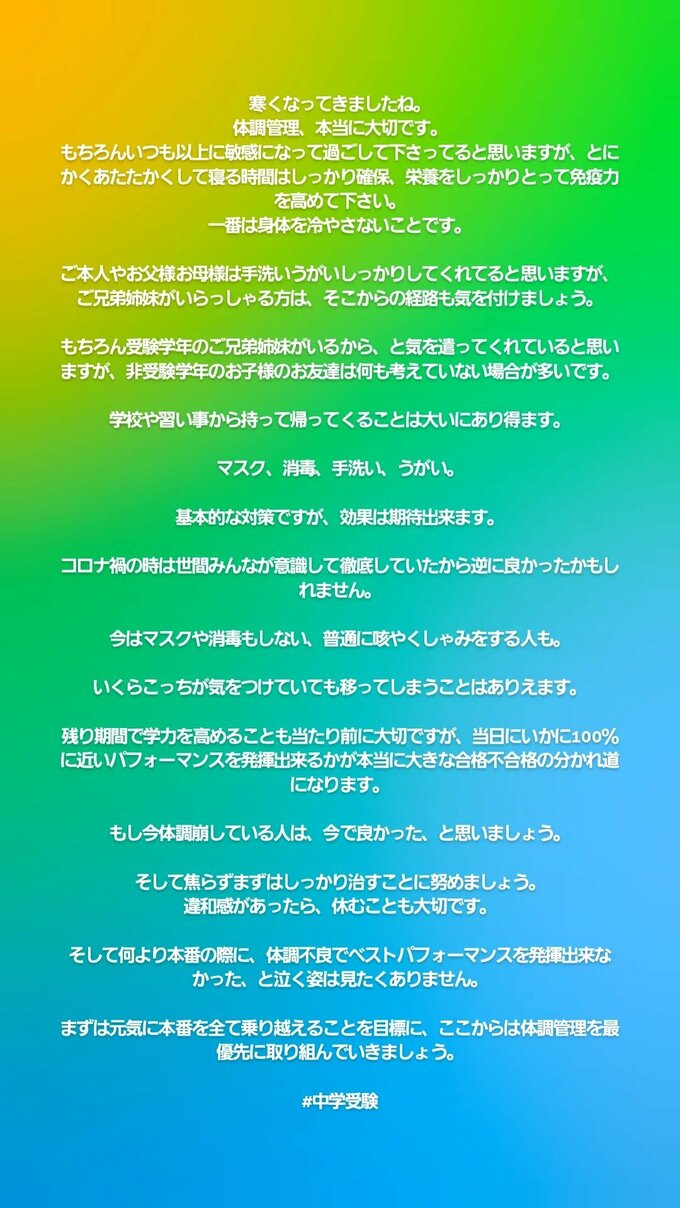 小堀さんは「体調管理、本当に大切です」と書き出し「あたたかくしてる時間はしっかり確保、栄養をしっかりとって免疫力を高めて」と案内。受験生本人や父母による手洗いうがいはもちろんのこと、兄弟姉妹や非受験の子達からの感染に注意するよう呼びかけています。