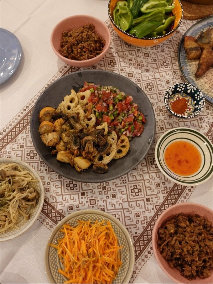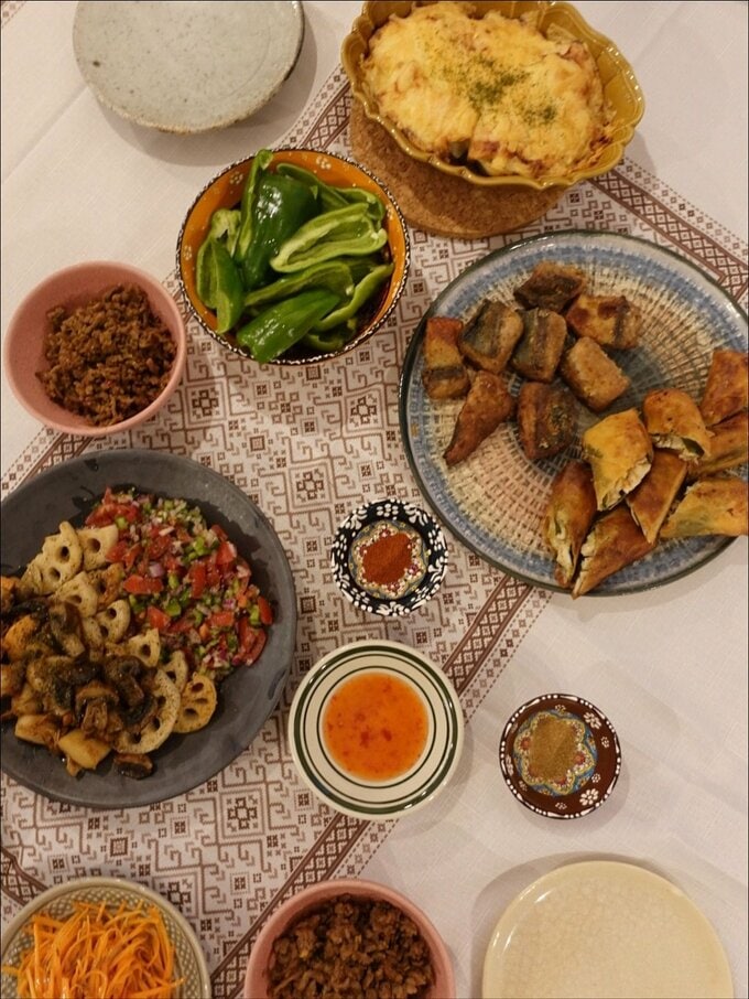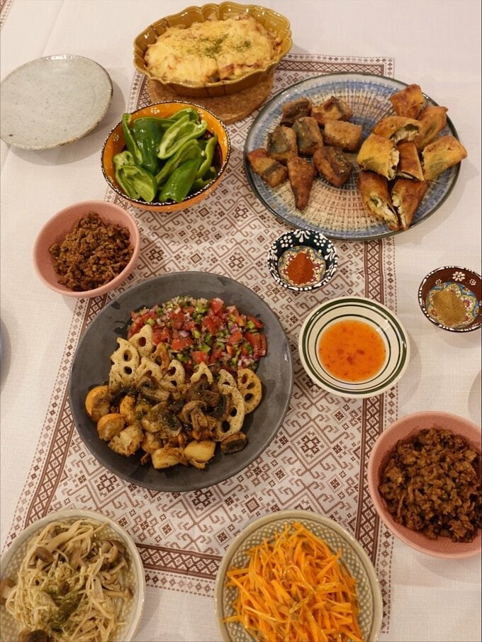 投稿された写真には、幾何学模様のテーブルクロスの上に、色とりどりの料理が並ぶ様子が映し出されています。