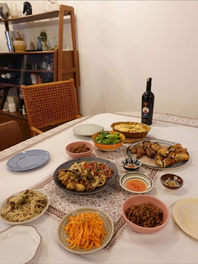 トルコで購入したというテーブルクロスと食器を使ったテーブルコーディネートで、久しぶりに友人を招いての食事会を楽しんだようです。