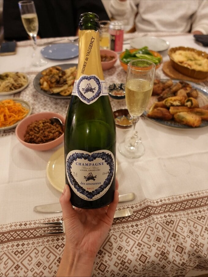 ドリンクには、同じく誕生日に贈られたシャンパンと、トルコで購入したというワインが用意されました。写真には緑色のボトルに金色のキャップ、白と青のラベルが特徴的なシャンパンを手に持つ様子も写っています。