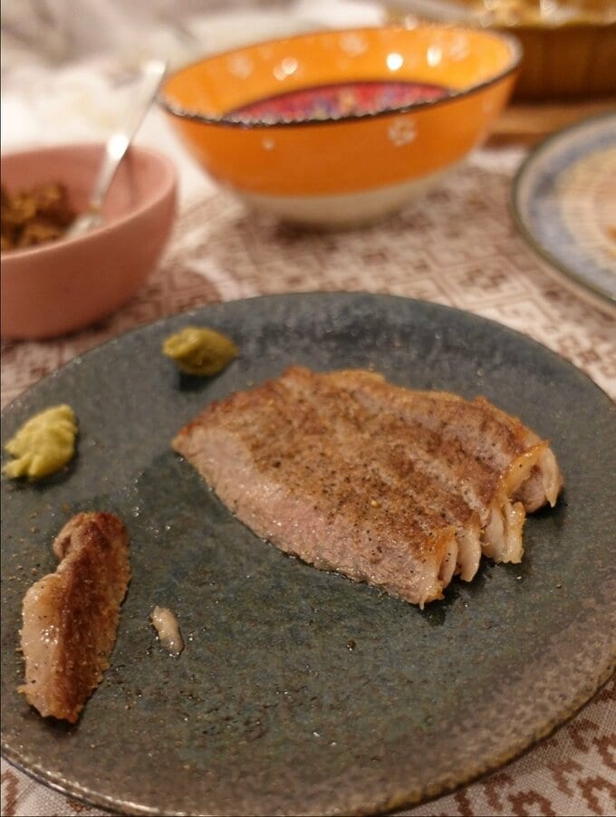 特別な一品として、誕生日にプレゼントされたという米沢牛のステーキも振る舞われました。深緑色の皿に盛られたステーキは、表面に焼き色がつき、断面は淡いピンク色に仕上がっています。