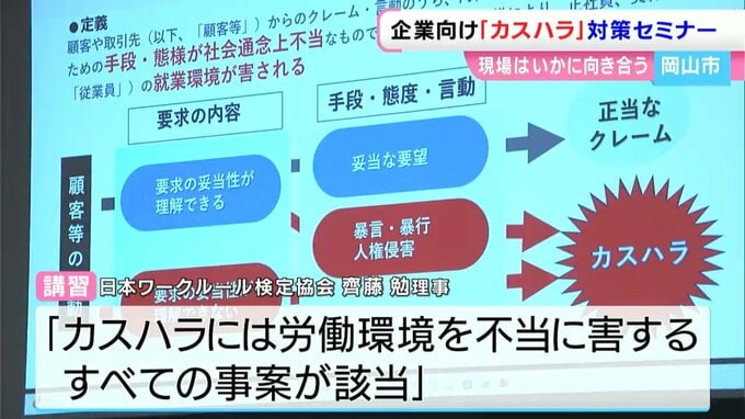 消費者から従業員への迷惑行為、いわゆるカスタマーハラスメントへの対策について学んでもらおうと、企業の経営者らを対象にした講習会が岡山市北区で開かれました。
