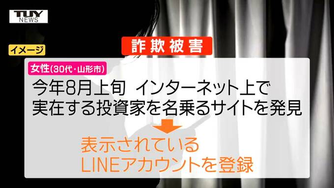 警察によりますと、今年8月上旬、山形市に住む30代女性はインターネットで資産運用について調べていたところ、実在する有名な投資家を名乗るサイトを見つけ、サイトに表示されていたLINEアカウントを登録したということです。