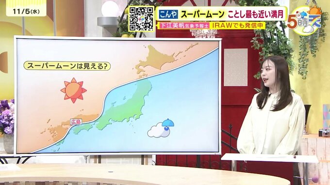 きょう5日(水)の広島県内は、朝から晴れたり曇ったりで、日差しが届くと暖かさを感じられました。最高気温は、沿岸部を中心に20℃を超えた地点が多く、昼間は小春日和になりました。こんやは地球から最も近い…