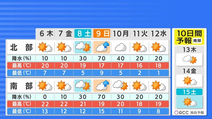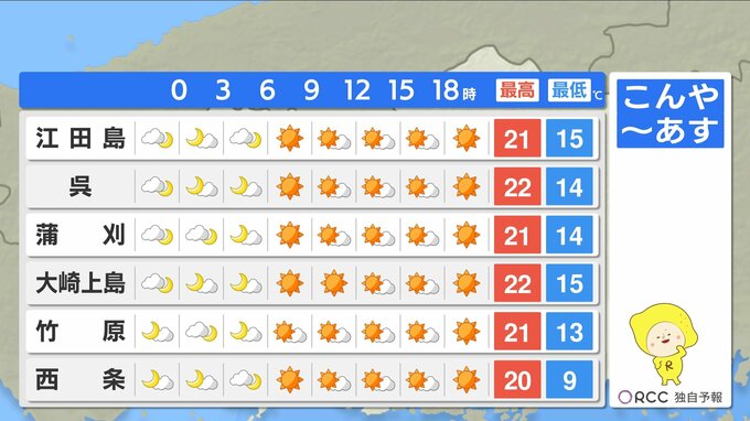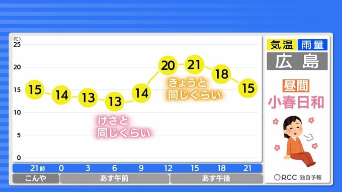 あす朝は、けさと同じくらいからけさよりも2℃~3℃ほど高くなり、さらに冷え込みは緩むでしょう。最高気温は20℃を超える地点がきょうよりも多い見込みで、昼間は上着いらずの暖かさになるでしょう。日没後は一気に気温が下がってくるので、重ね着をしっかりしてお過ごしください。
