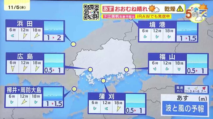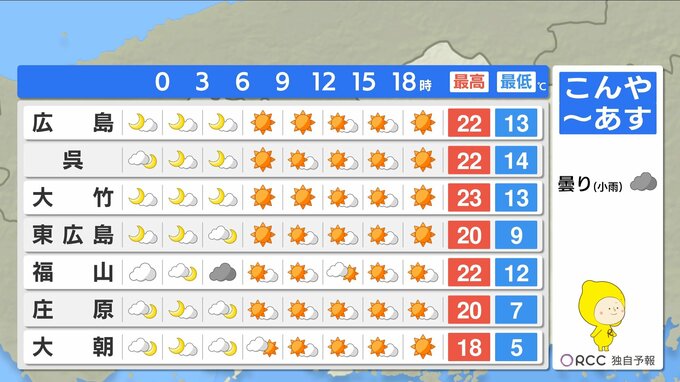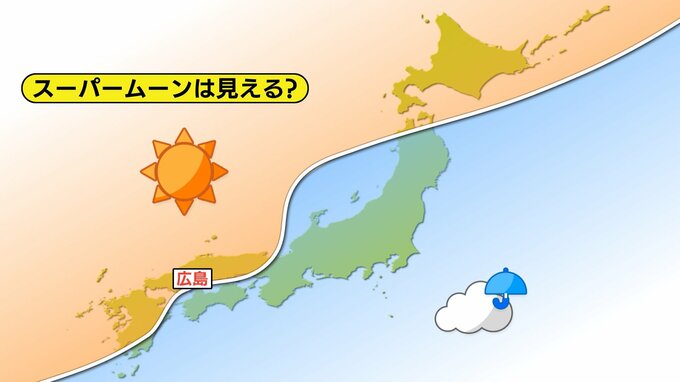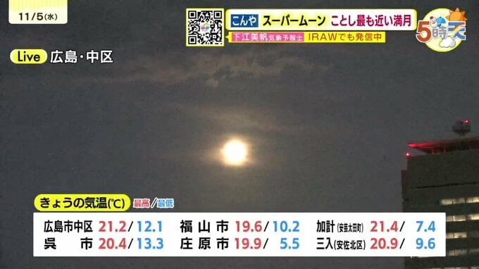 きょう5日(水)の広島県内は、朝から晴れたり曇ったりで、日差しが届くと暖かさを感じられました。最高気温は、沿岸部を中心に20℃を超えた地点が多く、昼間は小春日和になりました。こんやは地球から最も近い満月が見られるスーパームーンです。県内は、雲の隙間から見られるチャンスがあるので、ぜひ夜空を見上げてみてください。