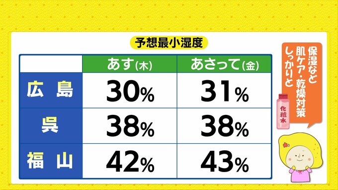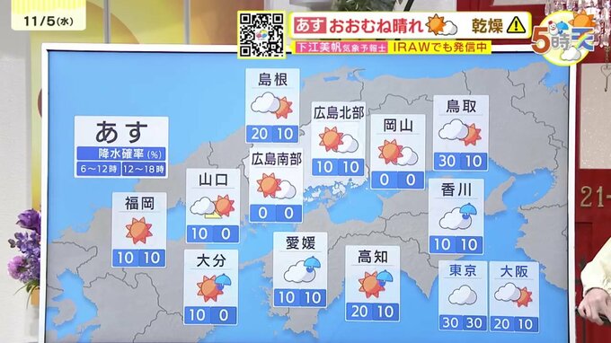 あすも秋の高気圧の影響でおおむね晴れるでしょう。ただ、現在本州の南に位置する低気圧や前線からの湿った空気の影響で、こんやからあす明け方にかけて南東部を中心に雲が広がりやすく、にわか雨の地点があるかもしれません。空気が非常に乾燥しますので、火の取り扱いにはご注意ください。また、肌のケアや保湿など乾燥対策もしっかりした方が良いでしょう。