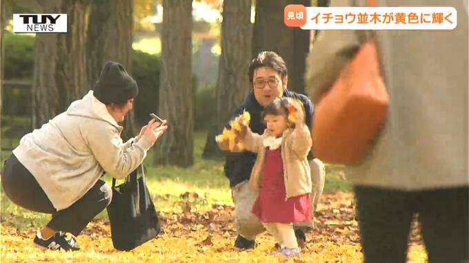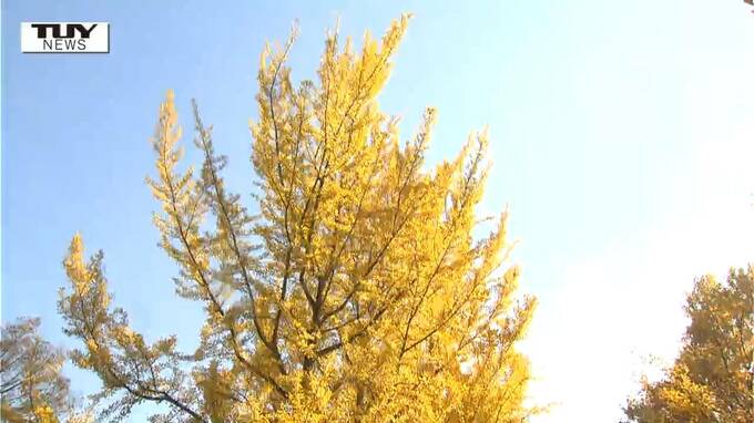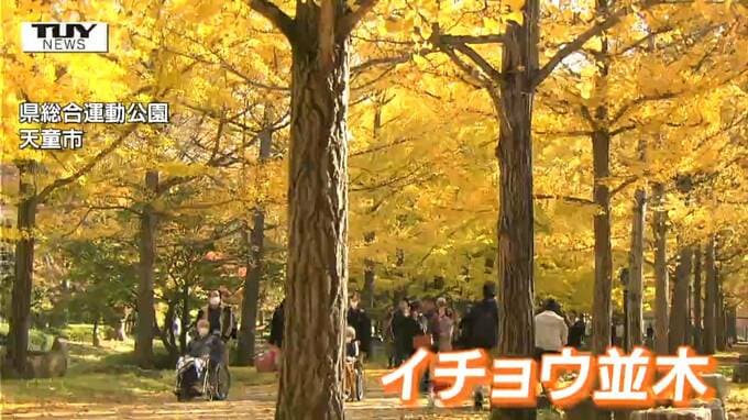 毎年人気の紅葉スポット、天童市県総合運動公園のイチョウ並木がいま見頃を迎えています。