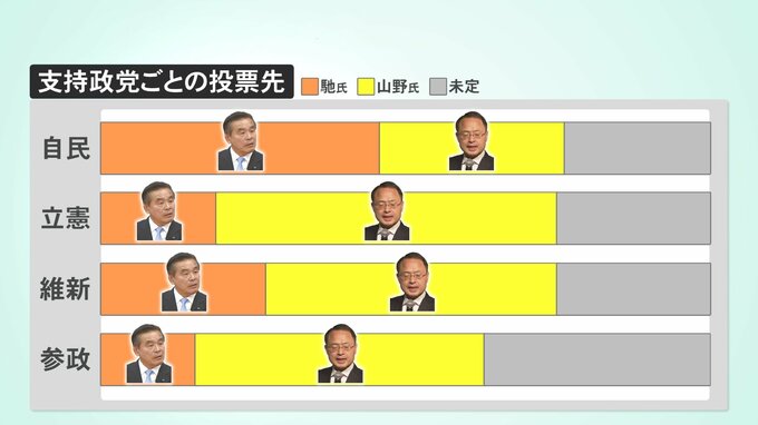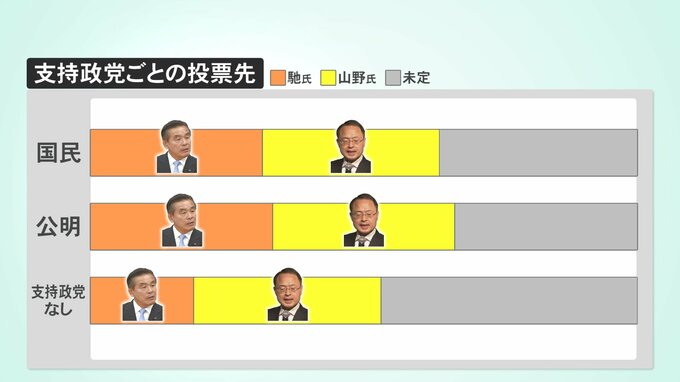 続いて、支持政党ごとの支持状況です。馳さんと山野さんは、共産党を除く各政党にすでに推薦願を提出しています。自民党は、馳さんが優位に。その一方で、立憲民主党と日本維新の会、参政党は山野さんが馳さんを引き離す結果となっています。国民民主党と、公明党は互角。また、支持する政党がないと答えた人では、山野さんが優位に立っています。