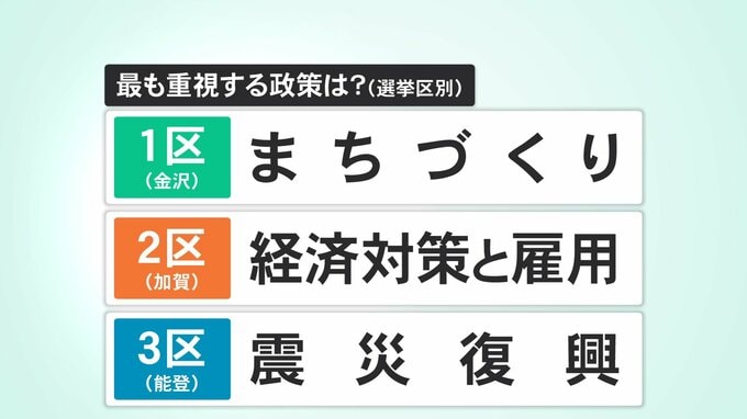 選挙区別で分析すると、都心軸の再開発や日銀跡地の利活用といった課題を抱える県都・金沢の1区では「まちづくり」。ものづくりの企業が集まり北陸新幹線が延伸した石川2区の加賀地区では、「経済対策や雇用」に関する政策を求める声があがっています。能登地区の石川3区では、やはり「震災復興」が重視されています。