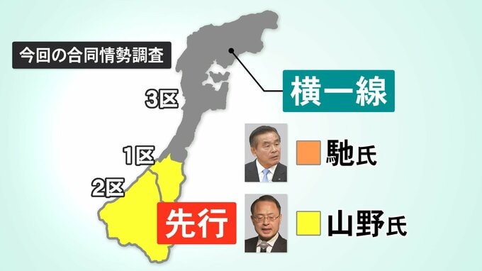 前回、2022年に保守三つ巴となった知事選で、自治体別に誰が最も票を獲得したかを表したものです。大票田・金沢では、直前まで市長だった山野さんが圧倒的な強さを見せました。一方で、その他の自治体では、馳さんと、当時出馬した元自民党参院議員の山田修路さんが票を分けあう形となりました。今回は自治体別ではなく、衆議院の選挙区ごとに調査した結果ですが、金沢市の石川1区と加賀地区の石川2区では、山野さんがリード。一方、能登地区がメインの石川3区では、馳さんがわずかにリードしているものの、ほぼ「横一線」の状況です。