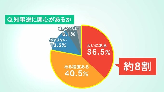 「今回の知事選挙に関心があるかどうか」を尋ねたところ、「大いに関心がある」と答えた人は36・5%、「ある程度関心がある」と答えた人が40・5%と、あわせて8割近くに上りました。今回の知事選、有権者の関心度の高さがうかがえます。