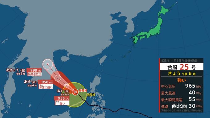 気象庁によりますと、きょう(5日)午後6時には、台風25号は強い勢力で南シナ海にあって1時間に約30キロの速さで西北西へ進んでいて、中心気圧は965ヘクトパスカル、中心付近の最大風速は40メートル、最大瞬間風速は55メートルとなっています。