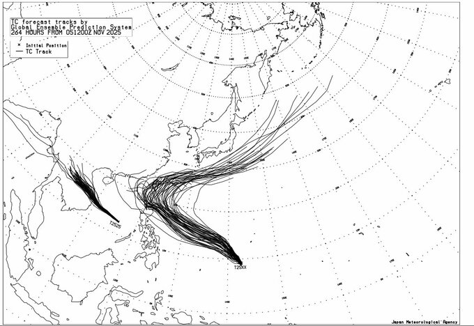 気象庁の週間予報解説資料にも、12日(水)は「熱帯じょう乱が沖縄の南を北上する」との記述があります。その後の進路はまだ定まっておらず、本州の南の海上を東よりに進むシミュレーションが多いですが、一部、九州~関東の太平洋側に接近するような予測もあります。今後の情報に注意してください。なお、日本列島に最も遅く上陸した台風は、1990年11月30日に和歌山県に上陸した台風28号となっています。11月に上陸した台風は、1951年の統計開始以来、この1つだけです。