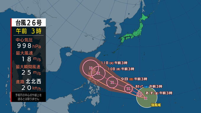 気象庁は6日午前3時、日本のはるか南のマリアナ諸島(グアムの南西)で台風26号(フォンウォン)が発生したと発表しました。フォンウォンは香港がつけた山の名前です。このあと発達し暴風警戒域を伴いながら西寄りに進み、10日(月)午前3時には非常に強い勢力でフィリピンの東に、11日(火)午前3時には強い勢力で南シナ海に位置すると予想されています。
