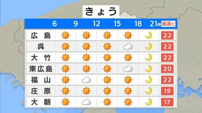 きょう6日(木)の広島県内の朝は、各地で晴れています。内陸の地域の霧は、もう少ししたら晴れてくるでしょう。最低気温は、広島13.0℃、呉13.3℃、三次9.3℃、高野2.9℃でした。